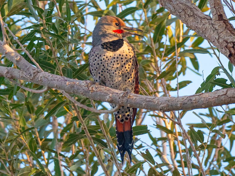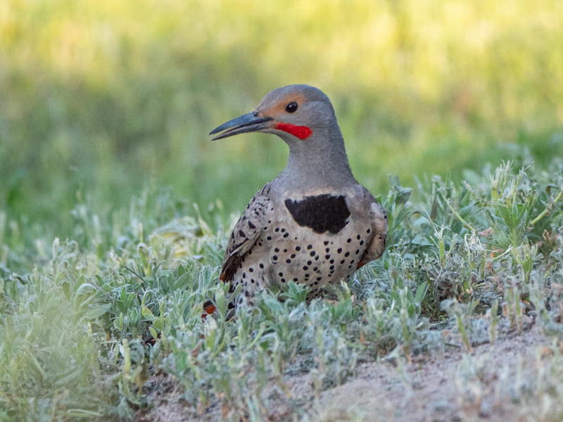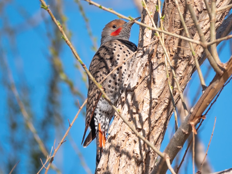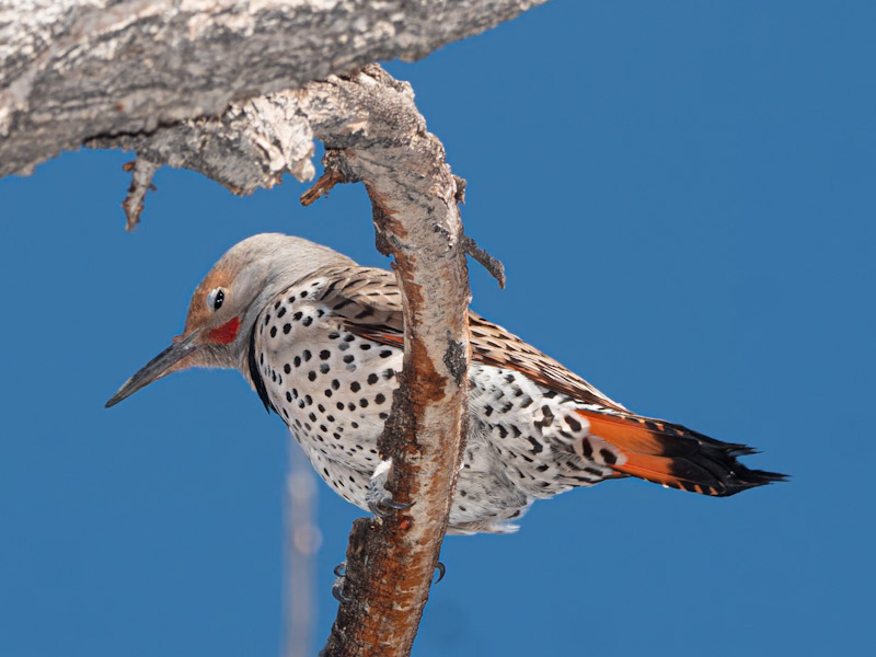 Description: The western red-shafted flicker (Colaptes auratus cafer) resides in western North America. It is red under the tail and underwings and has red shafts on its primaries. It has a beige cap and a gray face. Males have a red mustache. A necklace-like black patch occupies the upper breast, while the lower breast and belly are beige with black spots. Males can be identified by a black (in the eastern part of the species’ range) or red (in the western part) mustachial stripe at the base of the beak, while females lack this stripe. The tail is dark on top, transitioning to a white rump which is easily identified as the flicker flys away. Subspecific plumage is variable.