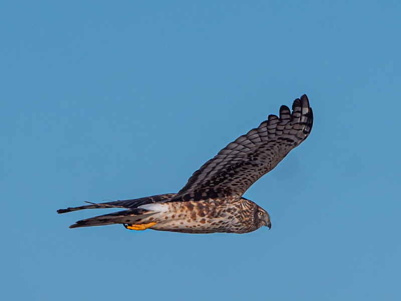 Description: The slender-bodied northern harrier has a long tail and wings, yellow legs, owl-like facial discs, a conspicuous white rump patch, and yellow eyes. Adult males have blue-gray upperparts and white underparts. The females are brown above and buffy below, with brown streaking down the sides of the chest and flanks. Juvenile harriers of both sexes have dark brown backs with rusty overtones and cinnamon underparts, with no streaking. The northern harrier is a medium-sized raptor. The female is typically larger than the male.