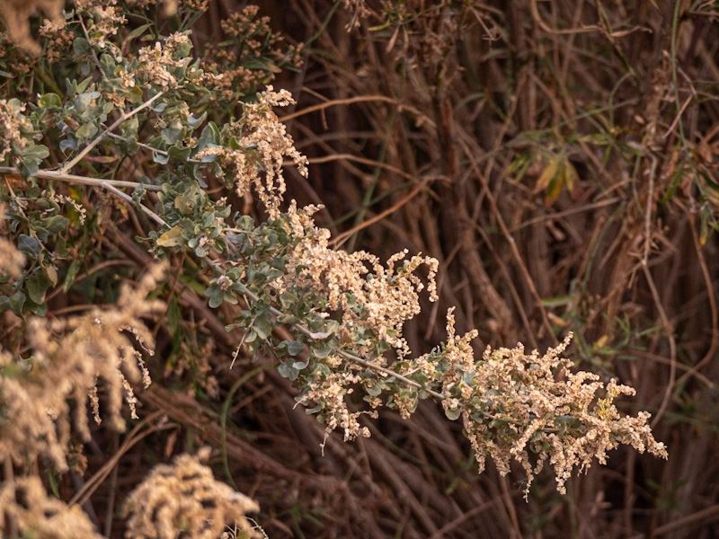 Description: Atriplex lentiformis is a spreading, communal shrub reaching one to three meters in height and generally more in width. It is highly branched and bears scaly or scurfy gray-green leaves up to 5 centimeters long and often toothed or rippled along the edges. This species may be dioecious or monoecious, with individuals bearing either male or female flowers, or sometimes both. Male flowers are borne in narrow inflorescences up to 50 centimeters long, while inflorescences of female flowers are smaller and more compact. Plants can change from monoecious to dioecious and from male to female and vice versa.