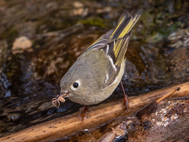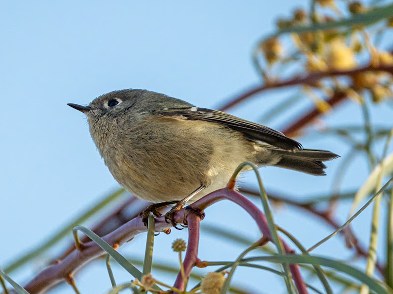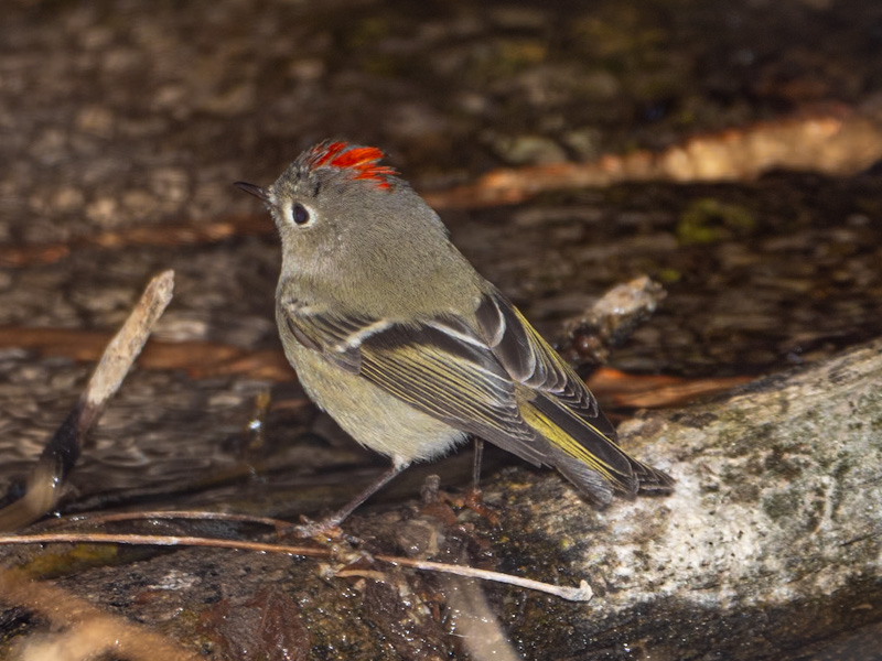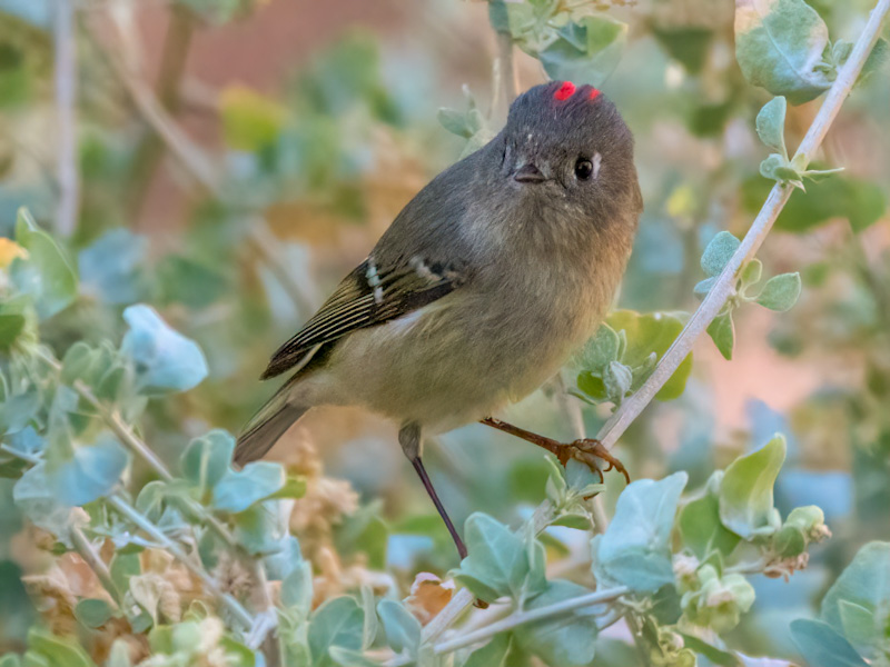 Description: The ruby-crowned kinglet is a very small bird. It has gray-green upperparts and olive-buff underparts. It has two white wingbars and a broken white eye ring. The wingbar on the greater secondary coverts (closer to the wing-tip) is wider, and is next to a dark band. The kinglet has a relatively plain face and head, although the male has a scarlet-red crown patch, which is usually concealed by the surrounding feathers. The crown patch is rarely orange, yellow, or not present. Females are identical to males (except for the crown). Immature birds are similar to adult females, since young males lack a crown patch. The kinglet usually moves along branches or through foliage with short hops, and flies with bursts of rapid wing beats. It is constantly active, and is easily recognized by its characteristic wing-flicking. Its flight has been described as “swift, jerky, and erratic”.