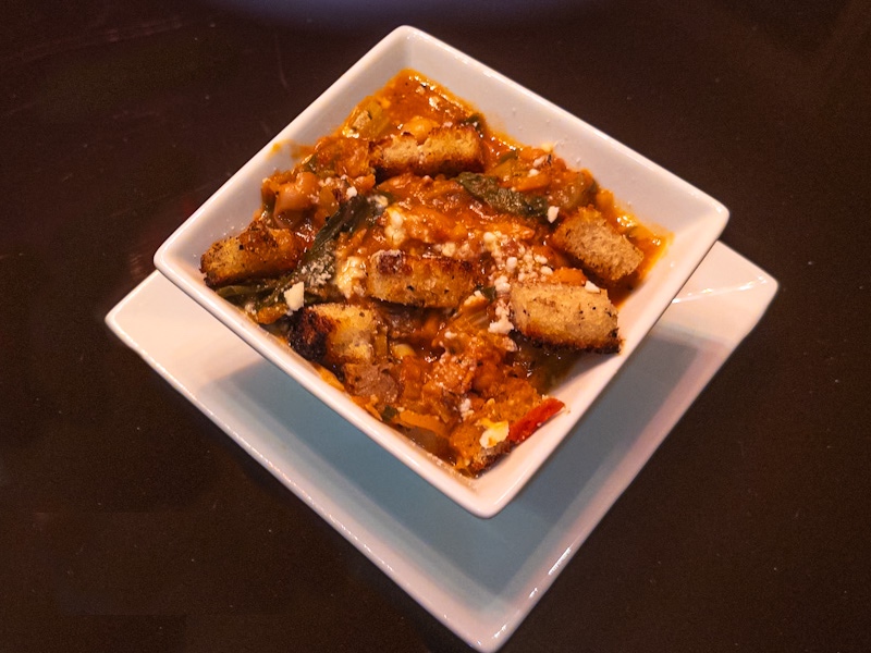 While the soup is simmering, chop bread into cubes, spray with olive oil, season and bake in the oven or air fryer until golden to make the croutons. I have a convection oven in my microwave.