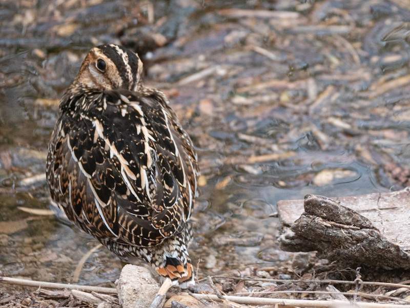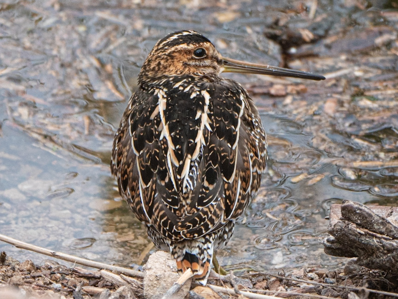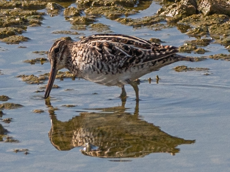 Description: They have short greenish-grey legs and a very long straight dark bill. The body is mottled brown on top and pale underneath. They have a dark stripe through the eye, with light stripes above and below it. The wings are pointed.