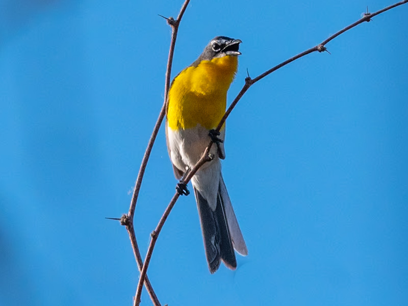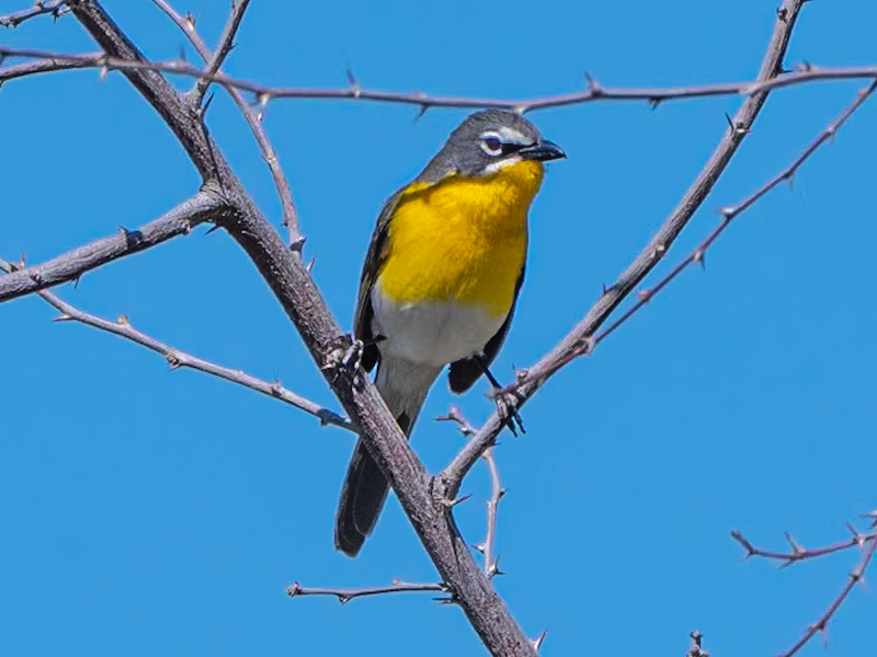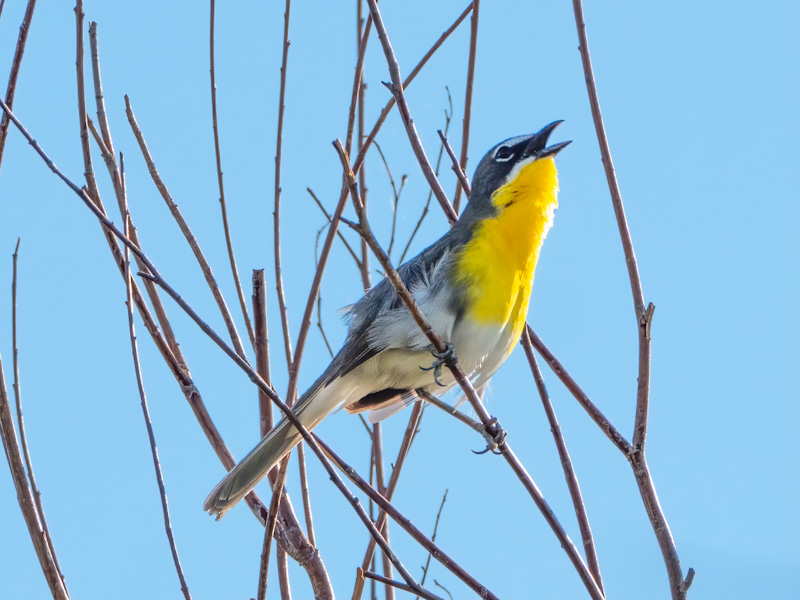 Description: These birds have olive/gray upper parts with white bellies and bright-yellow throats and breasts. Other signature features of yellow-breasted chats are their large, white eye rings, sub moustachial white stripe and blackish legs. When seen, this species is unlikely to be mistaken for any other bird.